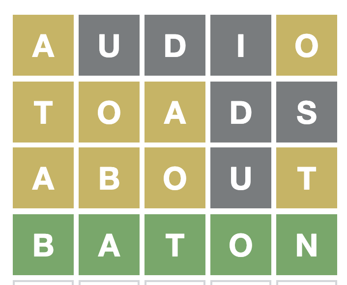 Los jugadores tienen todo tipo de estrategias de Wordle para elegir sus palabras iniciales. ADIEU es popular, para probar cuatro vocales. (El experto en estadísticas Nate Silver piensa que ADIEU es un «terrible primera conjetura.») Programador y diseñador de juegos Tyler Glaiel explica por qué la primera palabra matemáticamente óptima es ROATE, que no es una palabra de la que haya oído hablar.