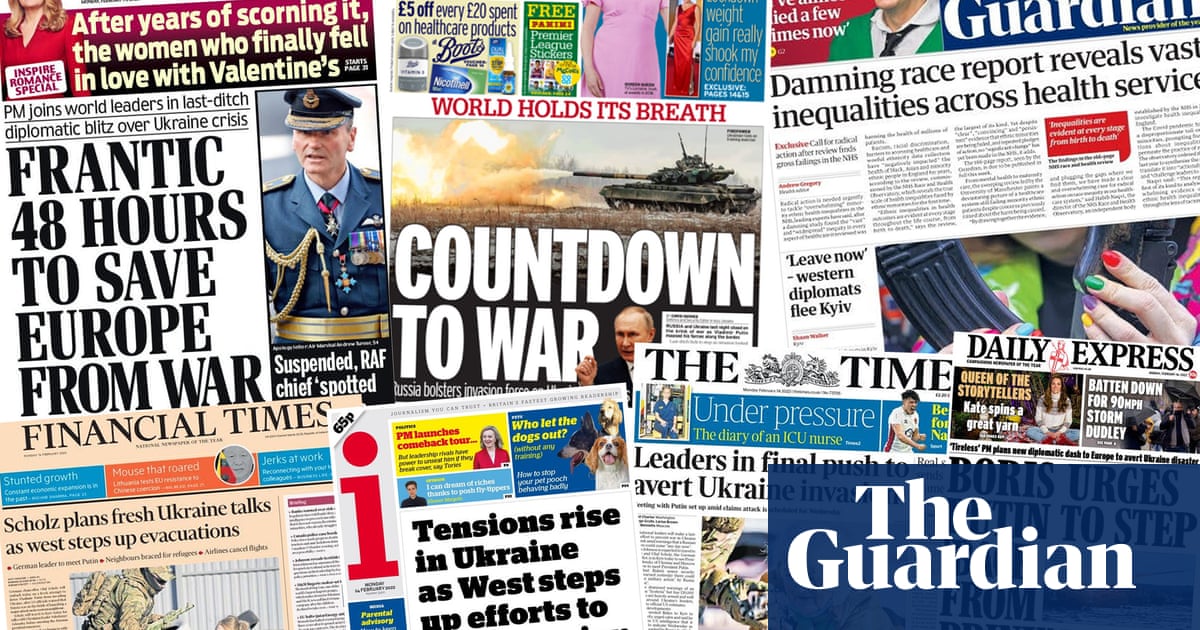 Los temores de que los esfuerzos diplomáticos no lograrán evitar una Invasión rusa de Ucrania en cuestión de días ocupan un lugar destacado en la mayoría de las portadas de hoy, a pesar de las últimas conversaciones anunciadas por Boris Johnson y el canciller alemán Olaf Scholz.
