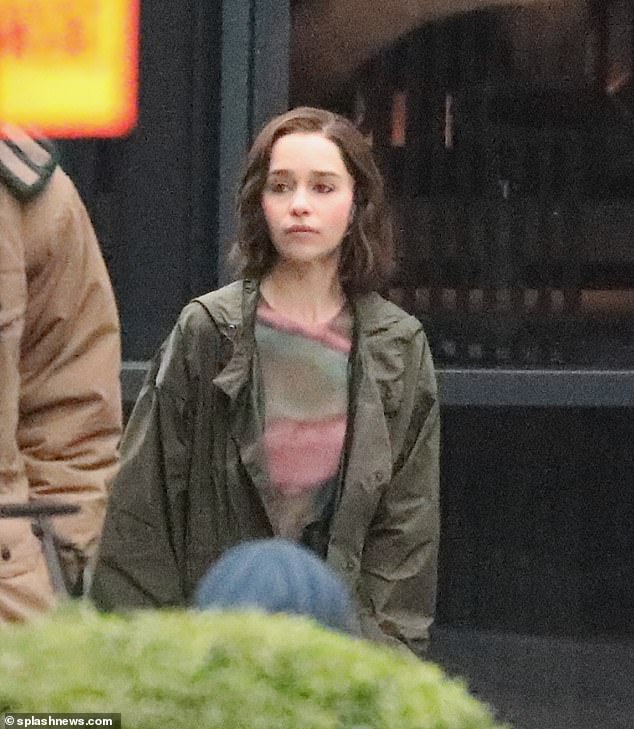 Emilia Clarke hizo un corte casual cuando fue vista en el set de Marvel’s Space Invasion por primera vez en Leeds el domingo.