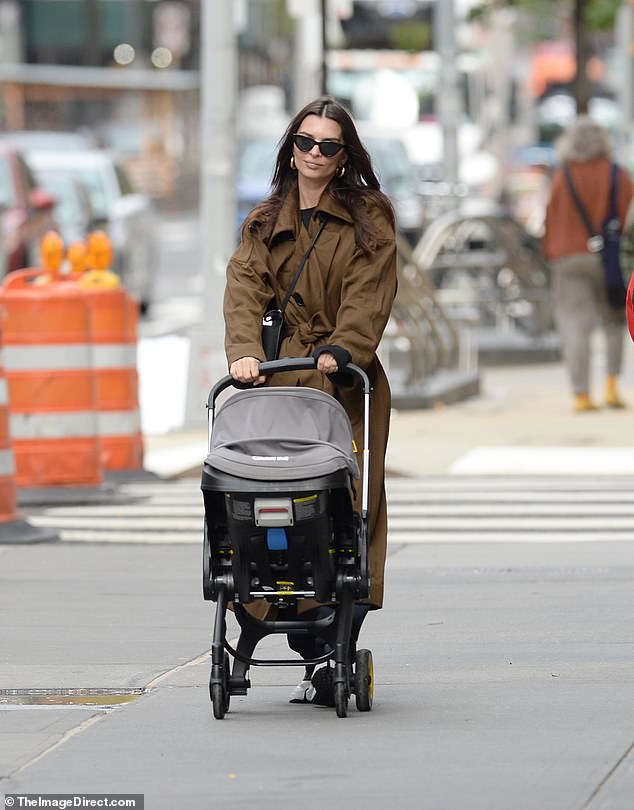 Mamá punteada: Emily Ratajkowski se veía feliz mientras salía a caminar con su esposo Sebastian Bear McClard y su hijo el viernes.