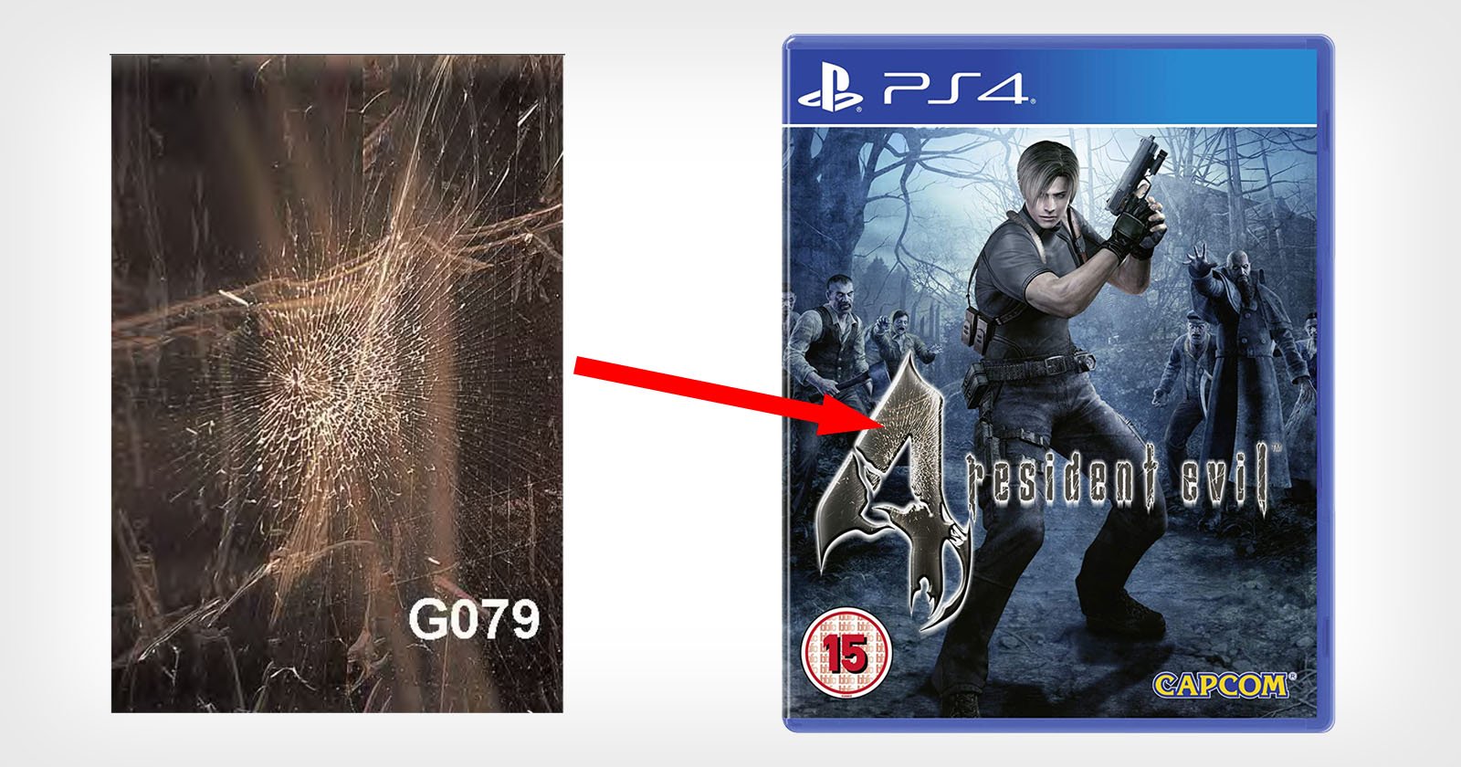 La ilustración A de la demanda se refiere al logotipo principal utilizado para el título Resident Evil 4, que parece usar detalles de un panel de vidrio roto que se muestra en superficies.