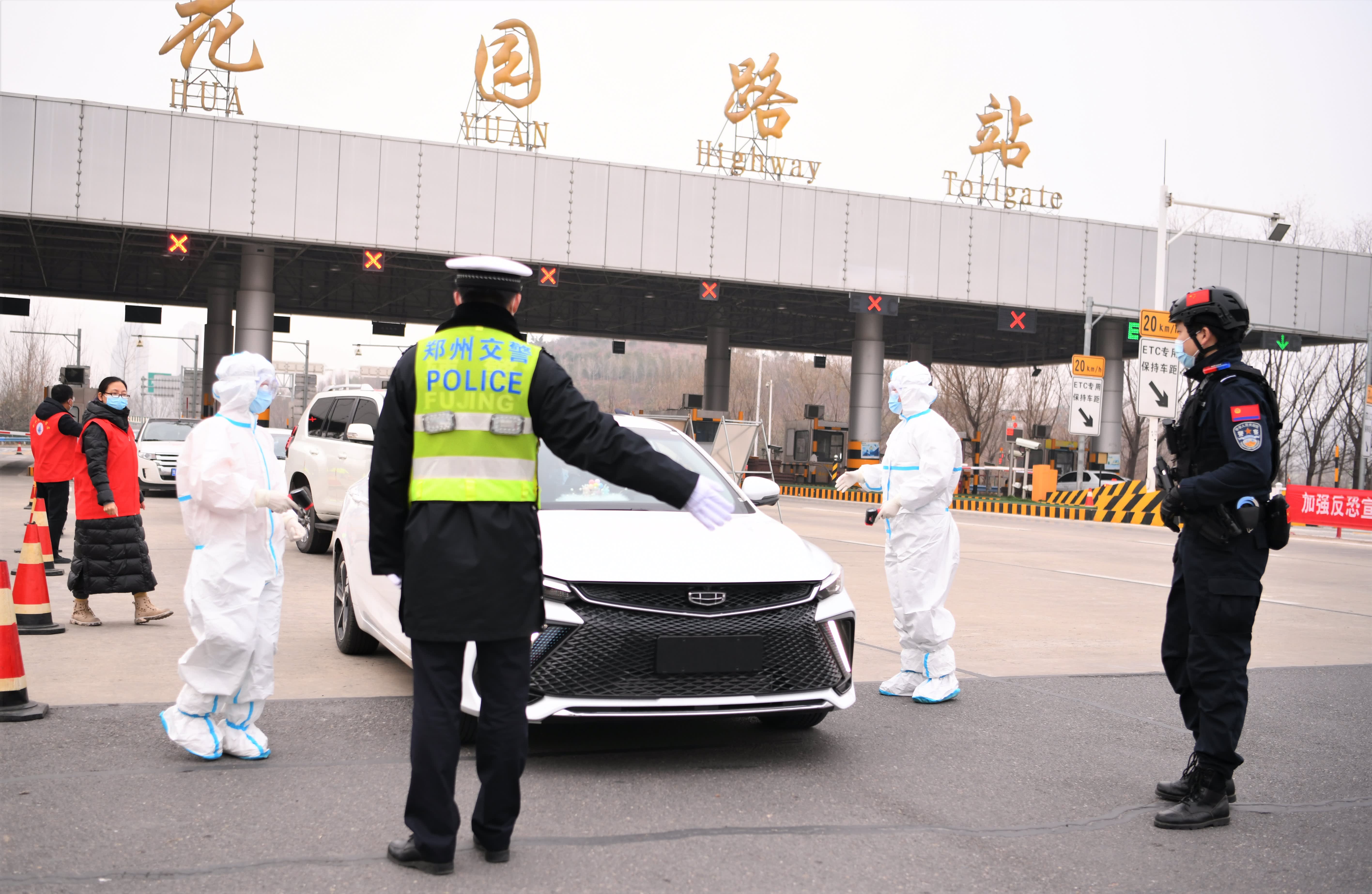 La policía de tránsito y el personal de prevención de epidemias trabajan juntos para revisar los vehículos en la entrada de una carretera en Zhengzhou, capital de la provincia china de Henan, la tarde del 8 de enero de 2022.