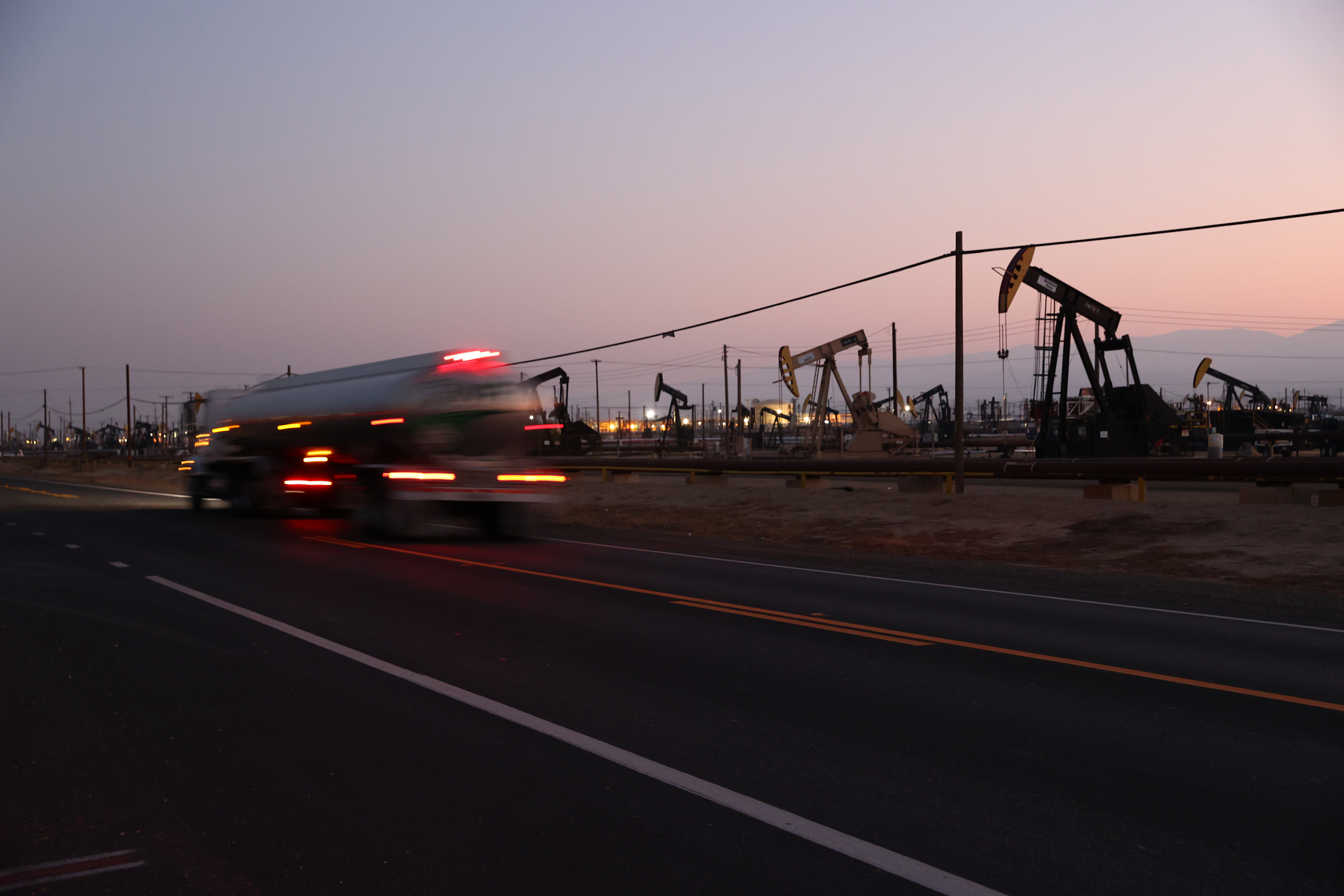 Un camión pasa bombeando agua en el campo petrolífero de Bellridge el 3 de noviembre de 2021 cerca de McKittrick, California.