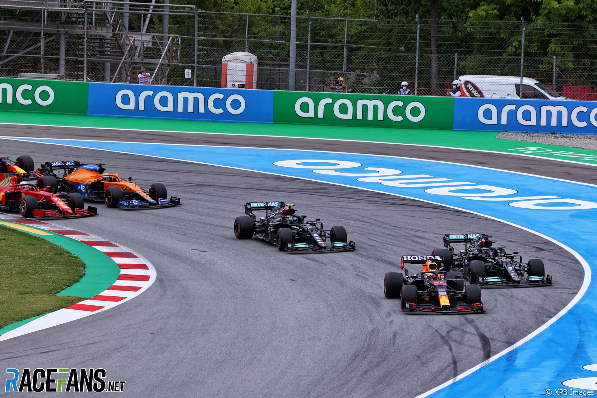 Max Verstappen (NLT) Red Bull Racing RP16B Lewis Hamilton (GPR) pasa el Mercedes AMG F1W12 al inicio de la carrera. 09.05.2021. Campeonato del Mundo de Fórmula 1, Rd 4, Gran Premio de España, Barcelona, ​​España, Día de la Carrera. – www.xpbimages.com, correo electrónico: [email protected] © Copyright: Moi / XPP Images