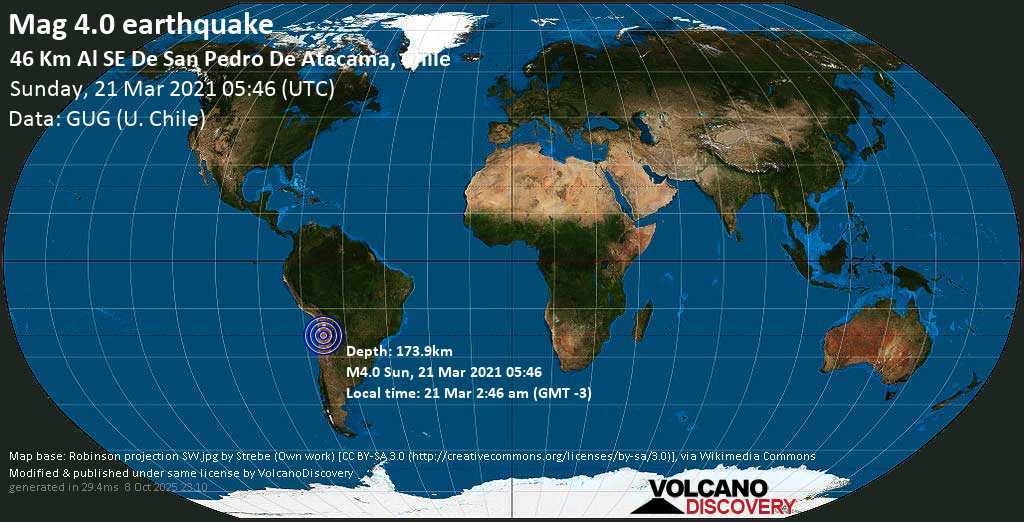 4.0 | 174 kilometros | A 46 km de San Pedro de Atacama en Chile. | Kak (U. Chile) |