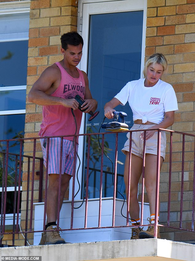 En acción: la cámara se trasladó a su balcón mientras la pareja trabajaba en el lijado de las barandillas antes de pintar.