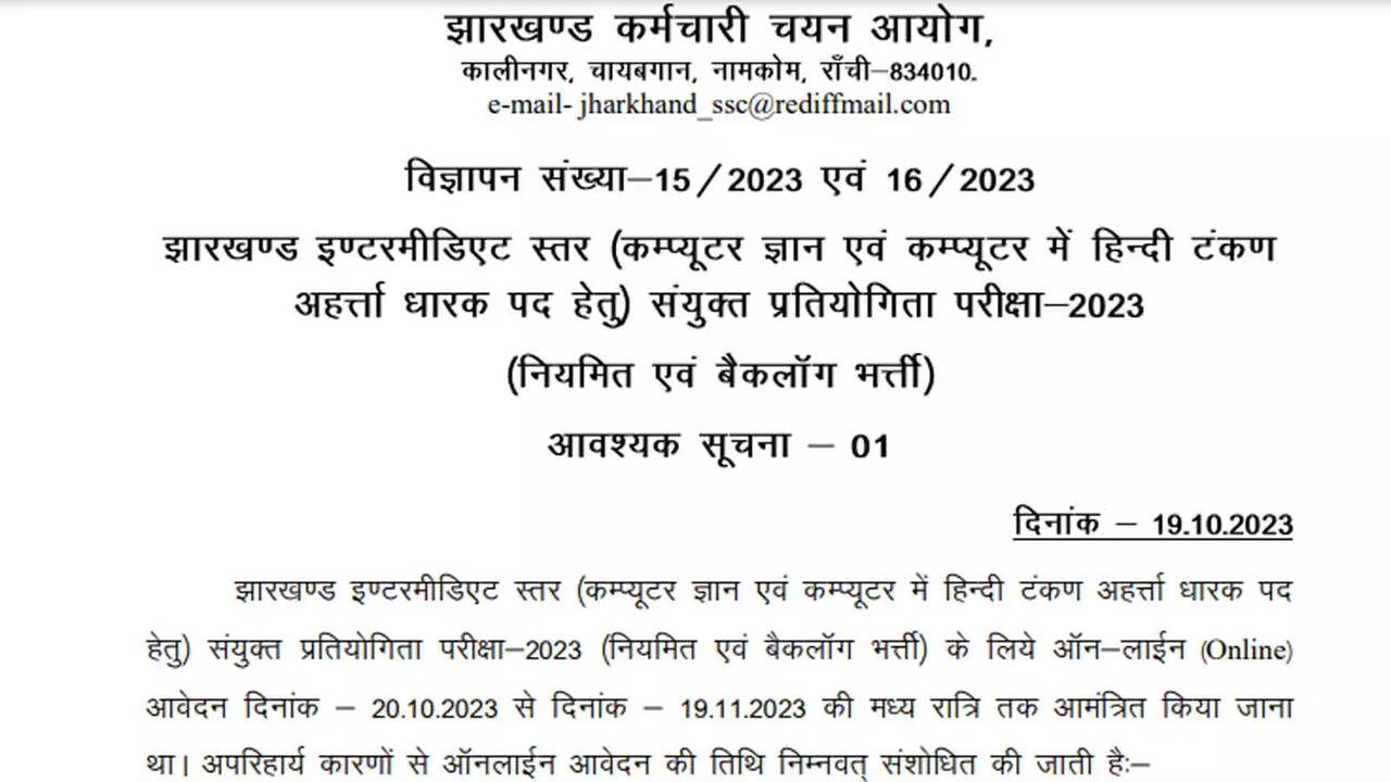 JSSC CCE 2023: La Comisión de Selección de Personal de Jharkhand (JSSC) ha anunciado una actualización importante con respecto a las fechas de solicitud para el examen competitivo conjunto de nivel intermedio de Jharkhand (alfabetización informática y escritura en hindi) – 2023 (contratación regular y atrasada). Originalmente, estaba previsto que las solicitudes se aceptaran desde el 20 de octubre de 2023 hasta el 19 de noviembre de 2023. Sin embargo, debido a circunstancias imprevistas, estas fechas se han revisado para adaptarse mejor a los candidatos potenciales.
