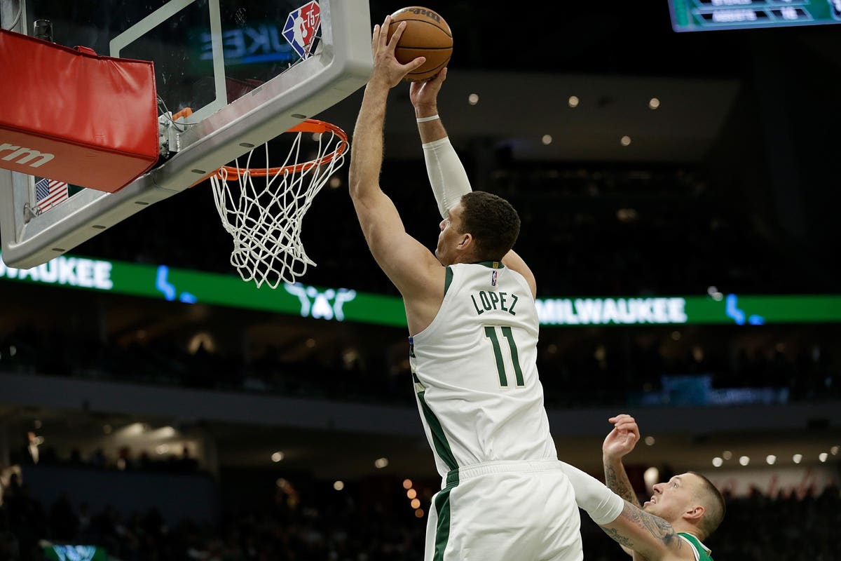 MILWAUKEE, WISCONSIN – 7 DE ABRIL: Brook Lopez #11 de los Milwaukee Bucks anota en un slam dunk durante … [+] la segunda mitad contra los Boston Celtics en Fiserv Forum el 7 de abril de 2022 en Milwaukee, Wisconsin. NOTA PARA EL USUARIO: El usuario reconoce y acepta expresamente que, al descargar o usar esta fotografía, el usuario acepta los términos y condiciones del Acuerdo de licencia de Getty Images. (Foto de John Fisher/Getty Images)