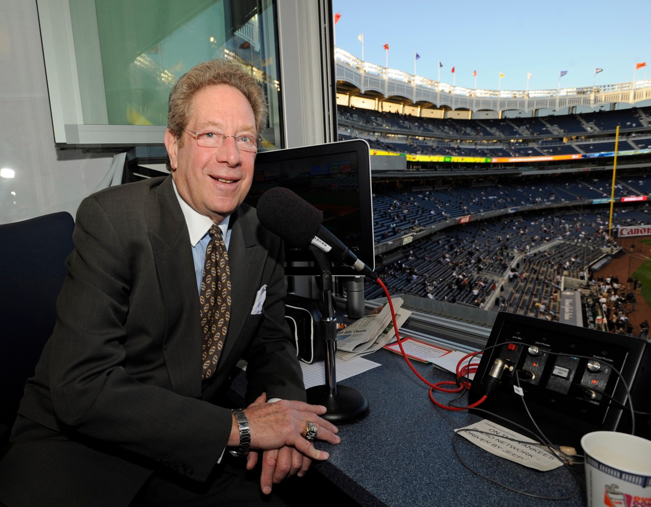 Archivo – En esta fotografía de archivo del 25 de septiembre de 2009, el locutor de los Yankees de Nueva York, John Sterling, se sienta en la cabina antes del partido de béisbol de los Yankees contra los Medias Rojas de Boston en el Yankee Stadium de Nueva York. El miércoles por la noche, 1 de septiembre de 2021, el dramaturgo de radio español Ricky Ricardo ayudó a Sterling a salir de un automóvil inundado. Tanto Sterling como Ricardo fueron invitados al partido de Nueva York en Los Ángeles desde el Yankee Stadium porque el equipo de radio no reanudó el viaje como parte del protocolo Covid-19. (Foto AB / Bill Gostrone, archivo)