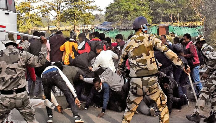 Policía de Jharkhand Acusado de lati Miembros de la secretaría voluntaria del panchayat estatal que marchaban hacia la asamblea para presentar sus demandas el 21 de diciembre. También se utilizaron cañones de agua y bombas lacrimógenas para dispersar a los manifestantes. El incidente ocurrió alrededor de las 3 pm a 4 pm cerca del templo Jagannathpur en Ranchi. Más de treinta personas se asociaron a la Unión de Voluntariado herido Al menos seis personas, entre ellas un niño, resultaron gravemente heridas.