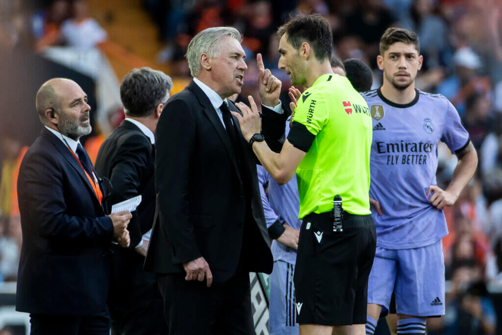 El árbitro Ricardo de Burgos Bengoetxea y Carlo Ancelotti conversan en la línea de banda (Matteo Villalba/Quality Sport Images/Getty Images)