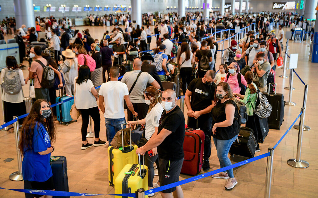 Viajeros en el Aeropuerto Internacional Ben Gurion, el 30 de junio de 2021, rumbo a las pruebas COVID-19. (Nati Shohat / FLASH90)