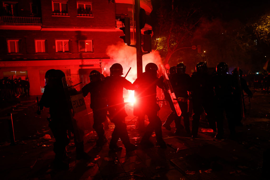 Agentes de la policía antidisturbios española se enfrentan a manifestantes durante una protesta cerca de la sede del Partido Socialista Español, tras las negociaciones del primer ministro en funciones, Pedro Sánchez, para conceder amnistía a las personas involucradas en el fallido intento de independencia de Cataluña de 2017, en Madrid, España, el 7 de noviembre de 2023. Foto por Susana Vera/ Reuters