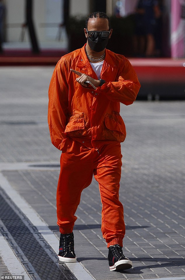ESTILO: Lewis Hamilton, de 36 años, hizo una declaración cuando salió vestido de naranja brillante en el Gran Premio de Fórmula 1 de Abu Dhabi en el circuito Yas Marina en los Emiratos Árabes Unidos el viernes.