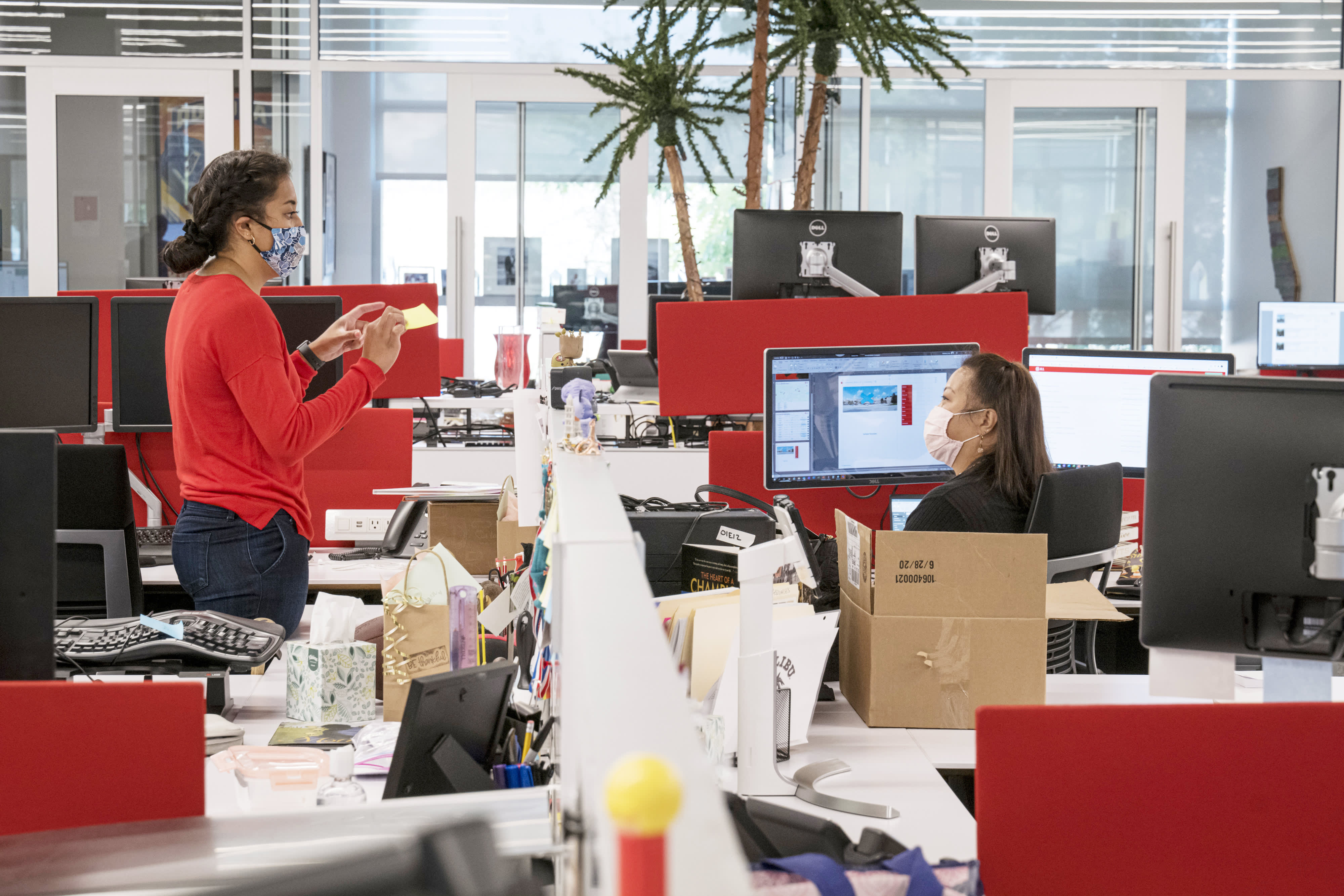 Los empleados usan máscaras protectoras en la oficina de JLL en Menlo Park, California, EE. UU., El martes 15 de septiembre de 2020.
