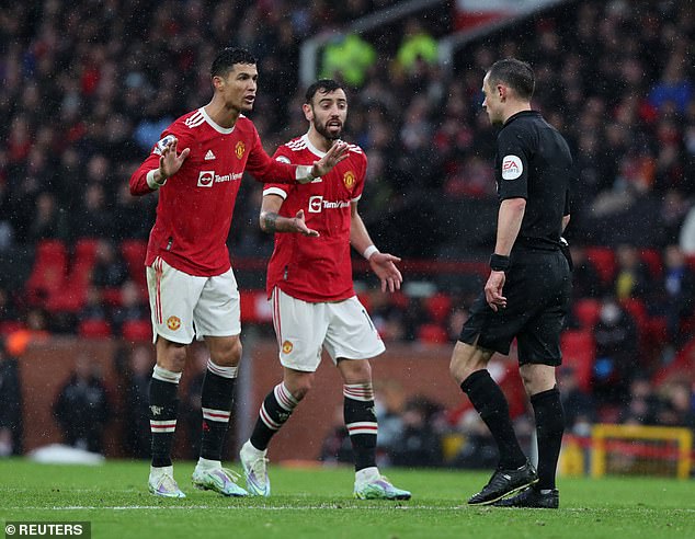 Cristiano Ronaldo y Marcus Rashford cuestionan al árbitro Stuart Attwell después de que el gol del United fuera anulado por fuera de juego