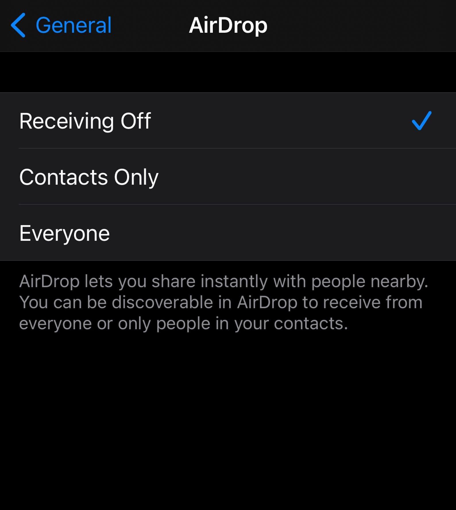 Sugieren que los usuarios de dispositivos Apple deshabiliten AirDrop – «Vaya a Configuración> General> AirDrop> Recibir» – y no abre el menú para compartir. Cuando realmente necesite compartir archivos, simplemente reinicie la función y apáguela cuando haya terminado.