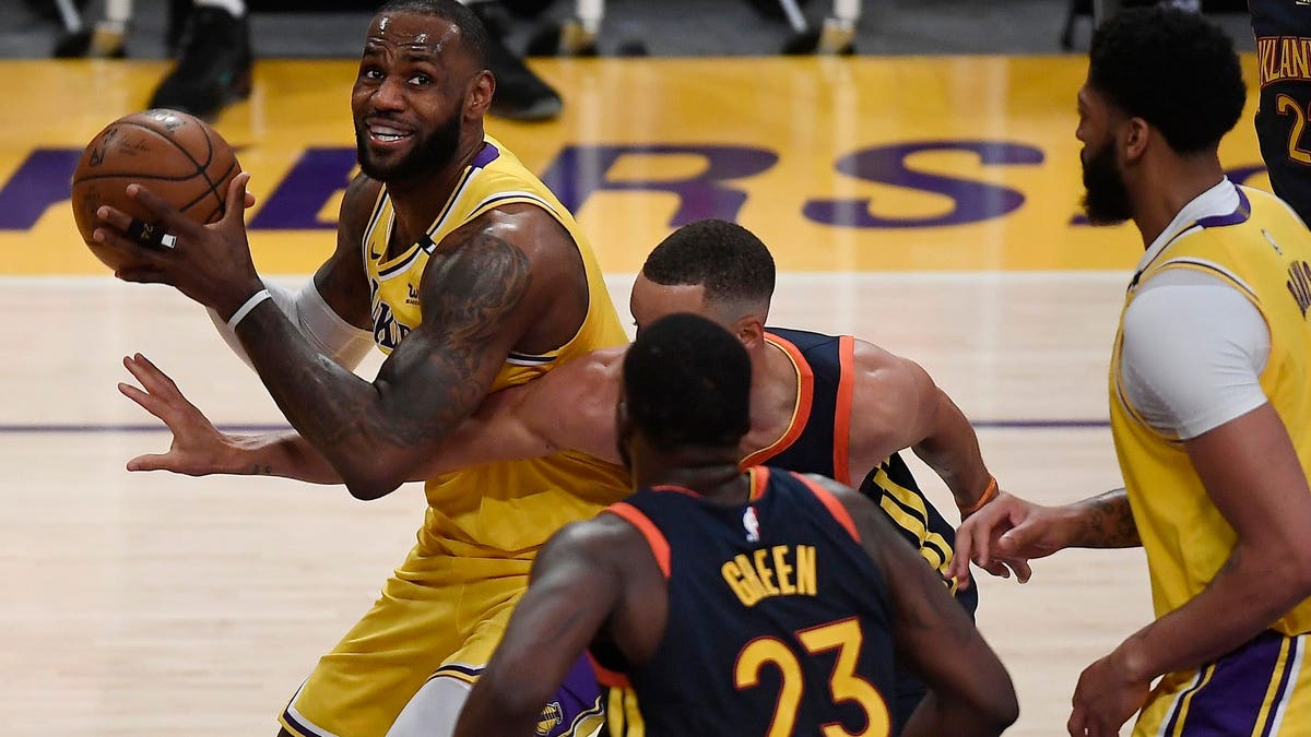 LeBron James # 23 de Los Angeles Lakers controla el balón como Draymond Green # 23 y Stephen Curry … [+] El # 30 de los Golden State Warriors defiende durante la primera mitad de un juego de Play-In del Torneo de la NBA en el Staples Center el 19 de mayo de 2021 en Los Ángeles, California. (Foto de Kevork Djansisian / Getty Images)