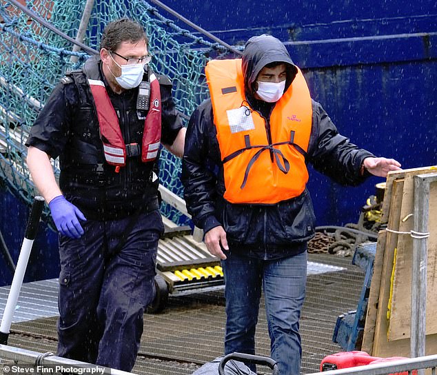 Un informe reveló que los migrantes que llegaron a Dover (un migrante que llegó este mes, en la foto) después de cruzar el Canal de la Mancha en pequeñas embarcaciones a menudo son enviados en un viaje de tres horas a un centro de detención con ropa mojada.