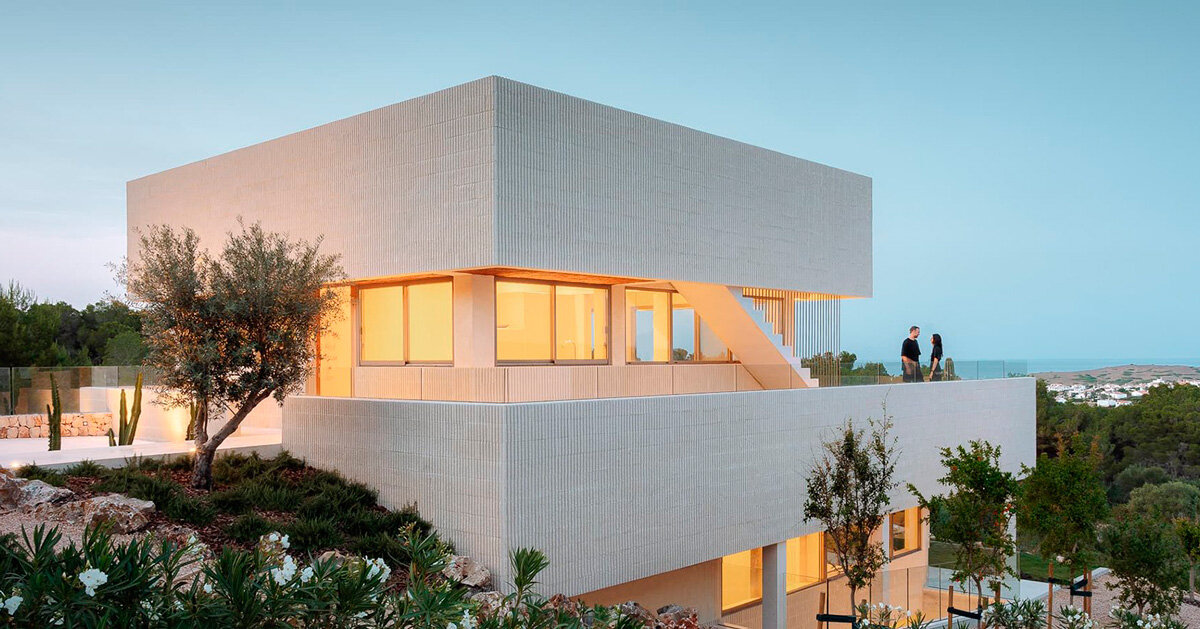 El peso del bloque de hormigón ranurado utilizado en la fachada genera una tensión gravitacional con las bandas de vidrio circundantes de 360°. El área común se abre a una terraza elevada que se extiende hasta una piscina, todo ubicado en el último piso con vistas al mar. Las ventanas continuas ofrecen vistas en todas direcciones y mucha luz natural. Se ha introducido un patio hundido en la planta baja para proporcionar abundante luz y ventilación a los tres pisos. Finalmente, una escalera exterior conduce al solárium en la azotea, que ofrece vistas panorámicas al mar Mediterráneo.