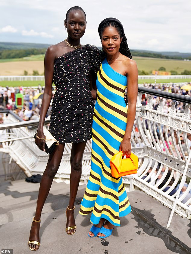 Glamour: Naomi Harris, 44 (derecha), destacó su físico con un colorido vestido a rayas con dobladillo con volantes mientras disfrutaba de un día de carreras en el Festival de Goodwood el sábado.