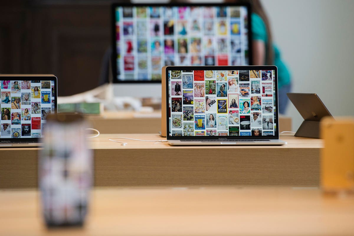 Las computadoras Apple MacBook se muestran durante la gran inauguración de la nueva tienda de la compañía, Apple … [+] La Biblioteca Carnegie de Washington, sábado 11 de mayo de 2019 (Foto AP / Cliff Owen)