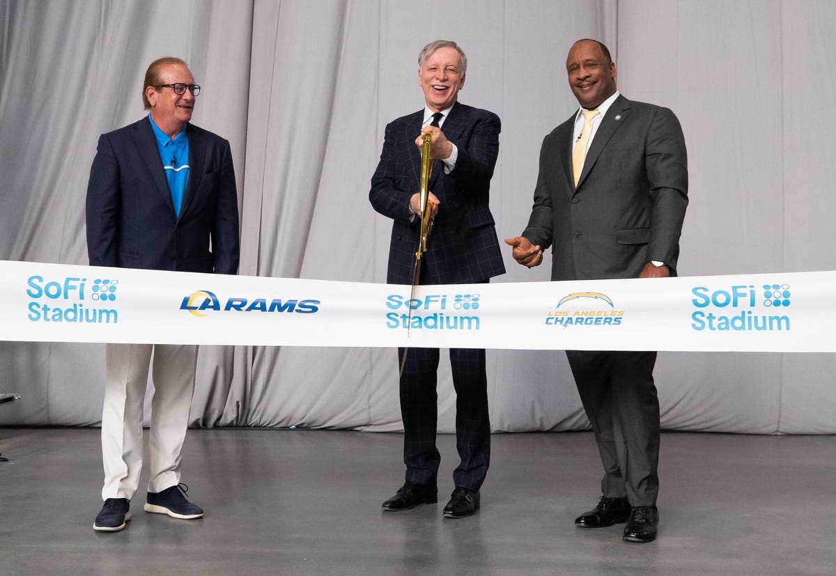 INglewood, CA – 8 DE SEPTIEMBRE: (LR) Propietario y presidente de Los Angeles Chargers Dean Spanos, Los … [+] El propietario y director ejecutivo de Angels Rams, Stan Kroenke, y el alcalde de Englewood, James T. Potts, Jr., asisten a un evento de corte de cinta en el estadio SoFi el 8 de septiembre de 2020 en Englewood, California. (Foto de Rich Fury / Getty Images para Hollywood Park Management)