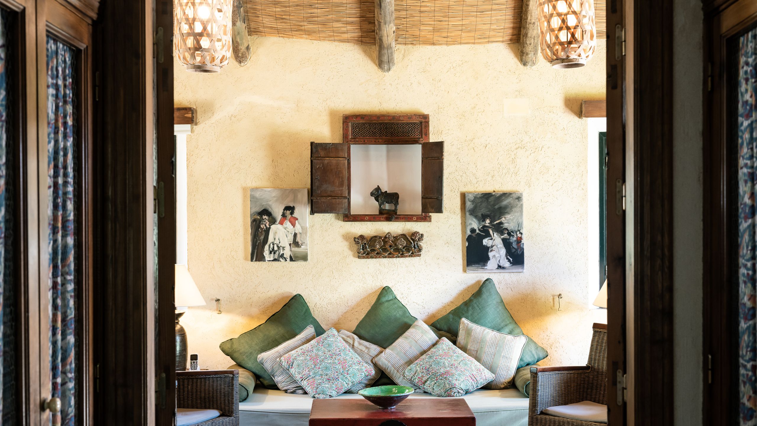 11 habitaciones (de lujo o gran lujo) ocupan el patio. Todos constan de dos plantas, con dormitorios y zonas de estar divididas entre las dos plantas y conectadas por una escalera de caracol de hierro forjado. Hay balcones compartidos en la parte delantera y acceso a los jardines en la parte trasera donde hay dos piscinas. La tercera piscina es compartida por los huéspedes de las tres cabañas independientes con techo de paja, cada una con su propio jardín y cabaña (Área de comedor/asientos al aire libre con techo de paja). No importa dónde se aloje, el ambiente decorativo es el mismo: suelos de baldosas de terracota, contraventanas de madera y una mezcla ecléctica de telas, artefactos y muebles importados de Marruecos, India o el Lejano Oriente, cuidadosamente mezclados con antigüedades españolas. Una villa privada de seis dormitorios exquisitamente diseñada se inauguró durante la pandemia y también se puede dividir por la mitad para crear dos villas de tres dormitorios si no se alquila toda la propiedad.
