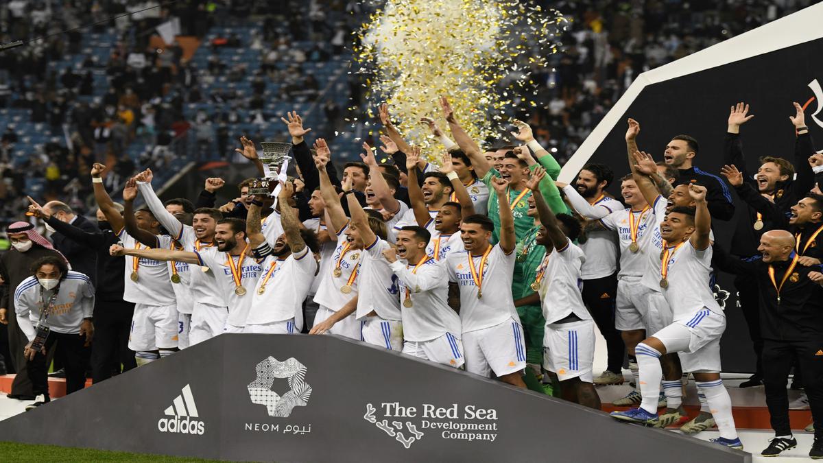 Los jugadores del Real Madrid celebran ganar la final de la Supercopa de España contra el Athletic de Bilbao el 16 de enero en el estadio King Fahd International de Riyadh.