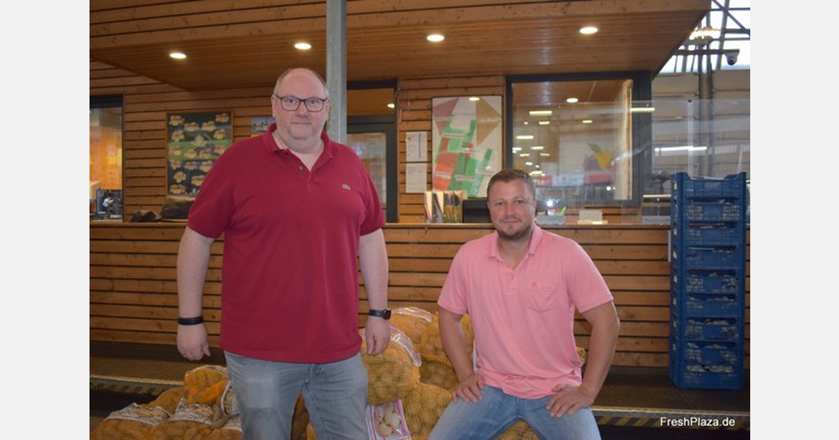El director general René Riegers y el director de ventas Torben Sander (derecha) en su stand en el mercado mayorista de Hamburgo