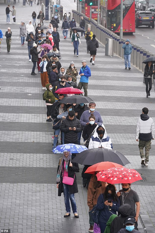 Miles de personas se alinearon bajo la lluvia para recibir golpes en Tottenham Hotspur en el norte de Londres ayer después de que el club de fútbol se convirtió en una clínica de vacunación móvil por el día. La mayoría de los vacunados estaban al final de la adolescencia o en la veintena.