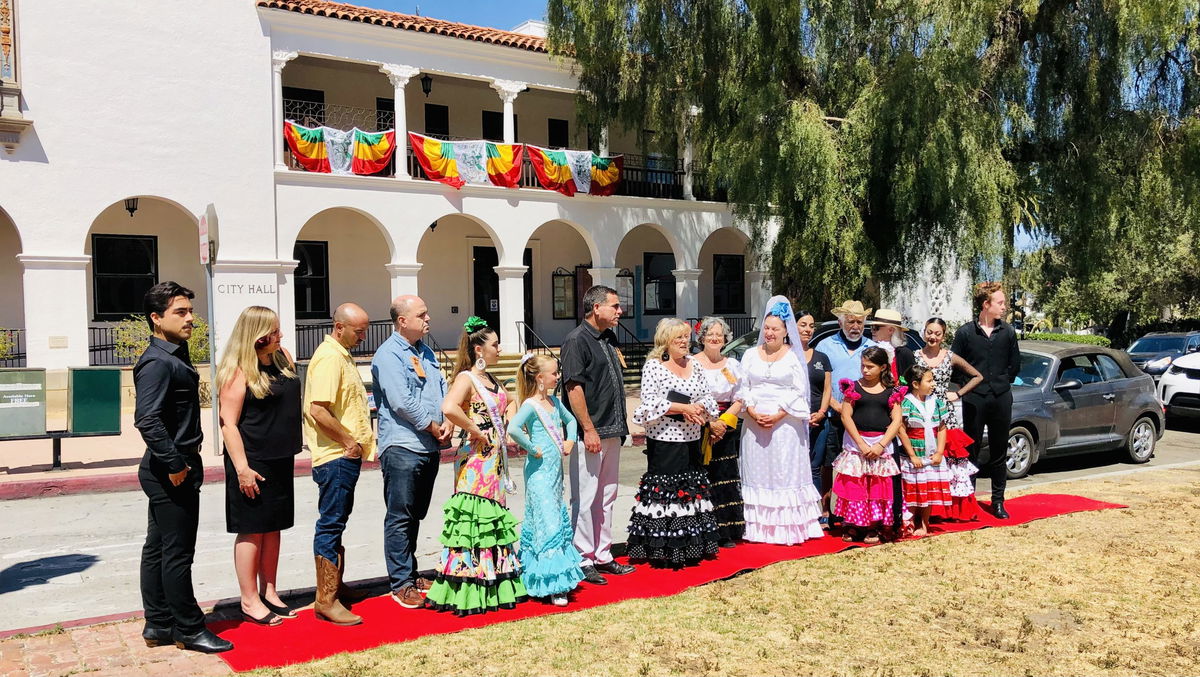 Los oficiales de los viejos tiempos españoles rodaron la alfombra roja en el césped de la plaza frente al Ayuntamiento de Santa Bárbara para hacer el anuncio el lunes por la tarde.