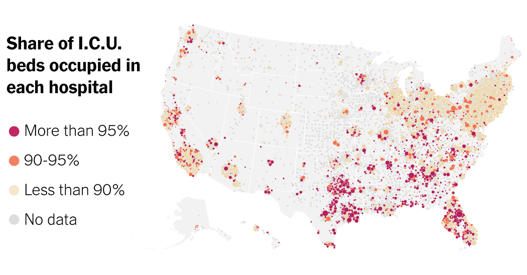 Uno de cada cuatro hospitales informa ahora que más del 95 por ciento de sus camas de cuidados intensivos están ocupadas, desde Uno de cada cinco el mes pasado. Los expertos dicen que puede resultar difícil mantener los estándares de atención para los pacientes más enfermos en los hospitales donde todas o todas las camas de cuidados intensivos están ocupadas.